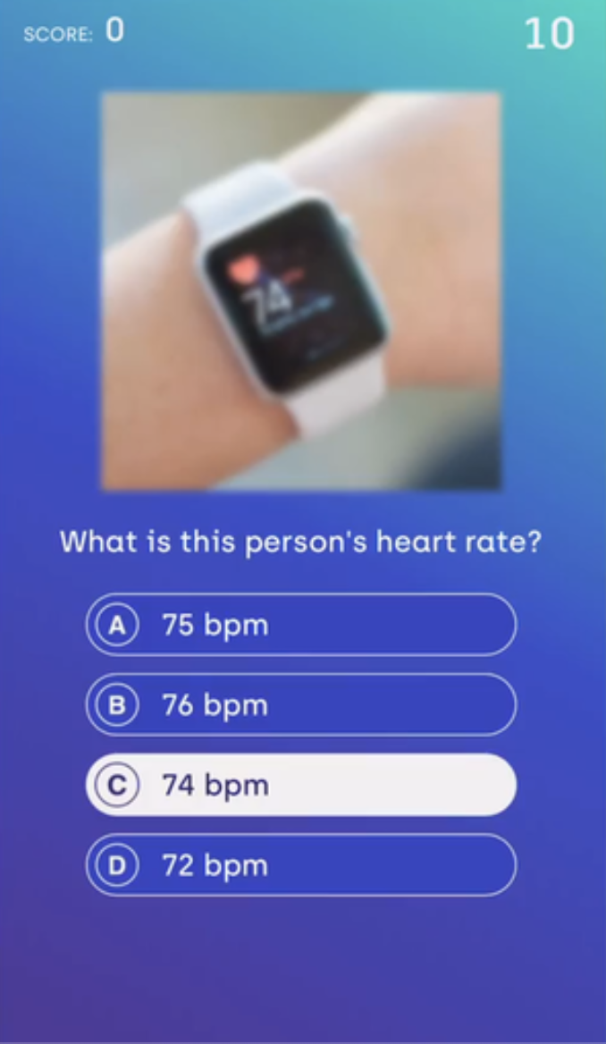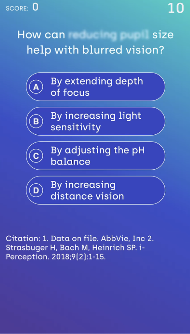 I pitched, designed, and developed a trivia game for doctors that helped promote eye clarity medication. The game revolved around players solving trivia questions as the answers started blurry and slowly came into focus. We worked closely with the client to ensure legal review and scientific accuracy.